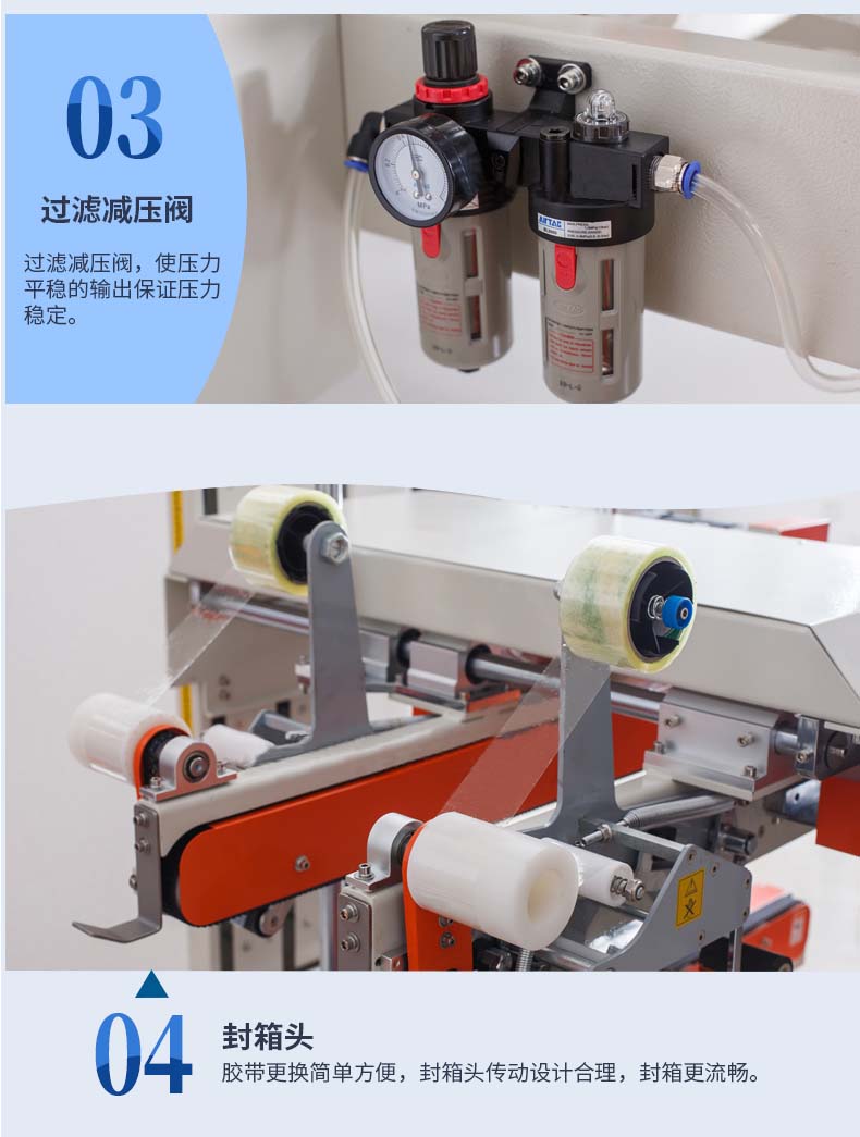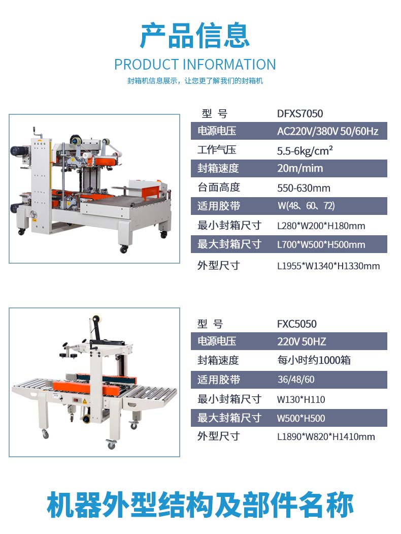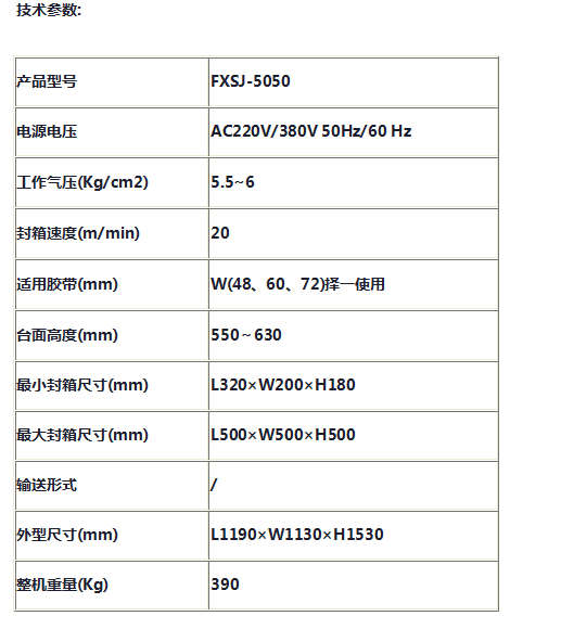 5、FXS5050四角边封箱机新型结构封箱头,封箱效果好,质量稳定,框架不易变形。使用时间长。