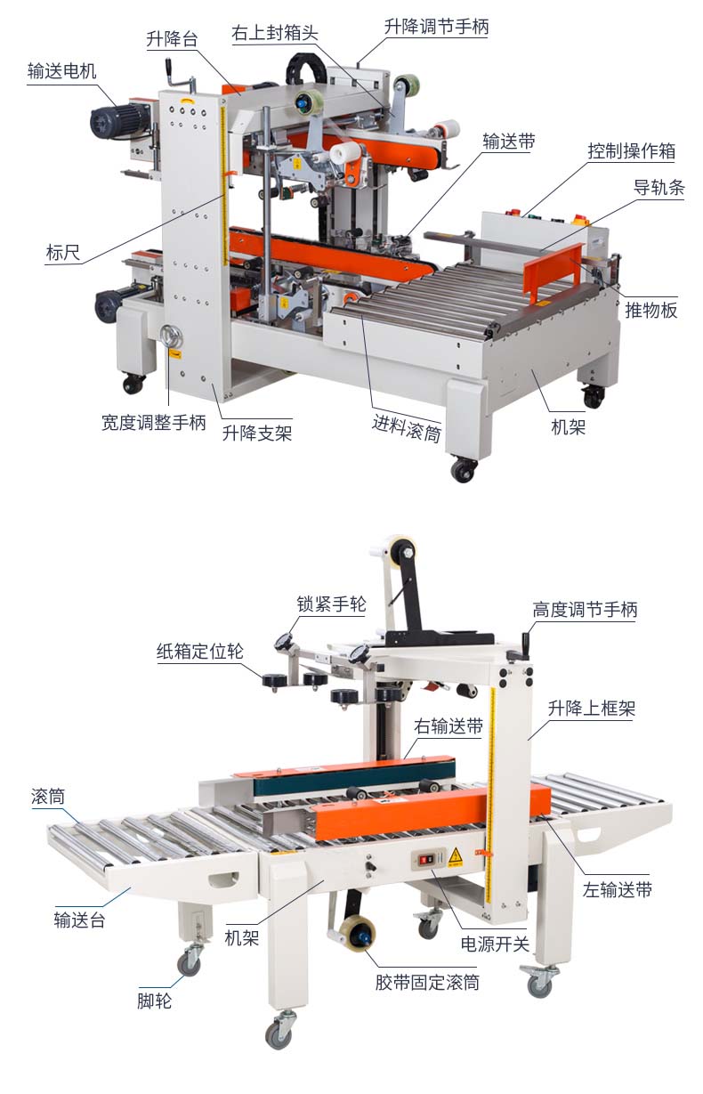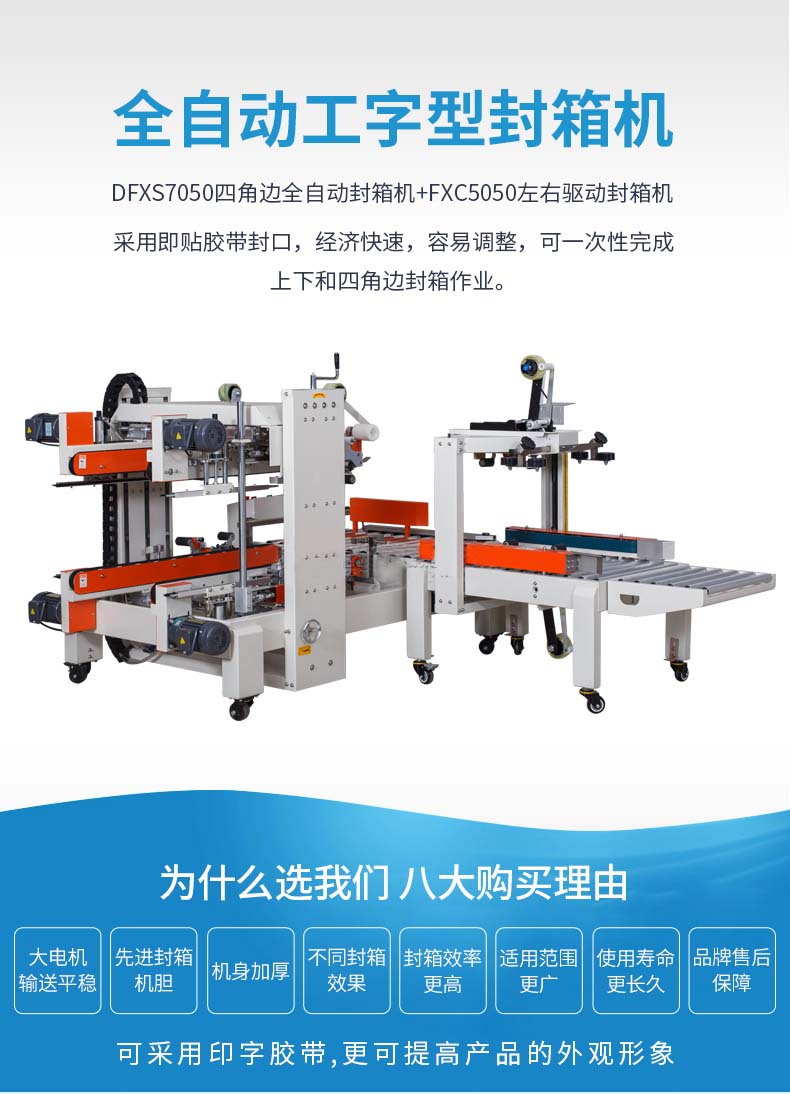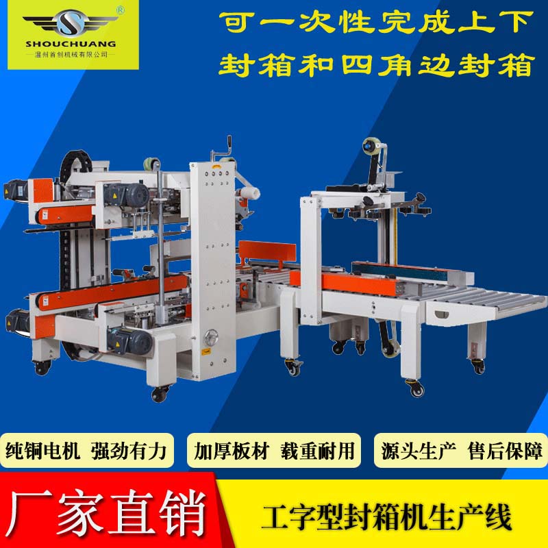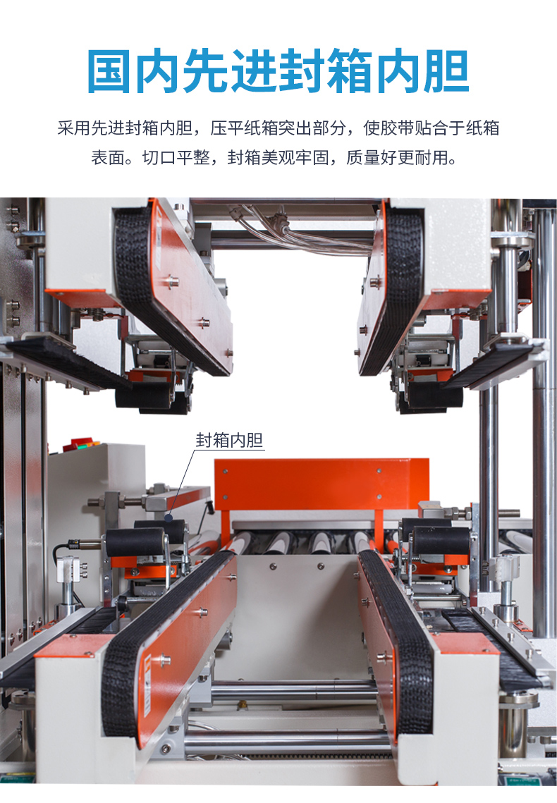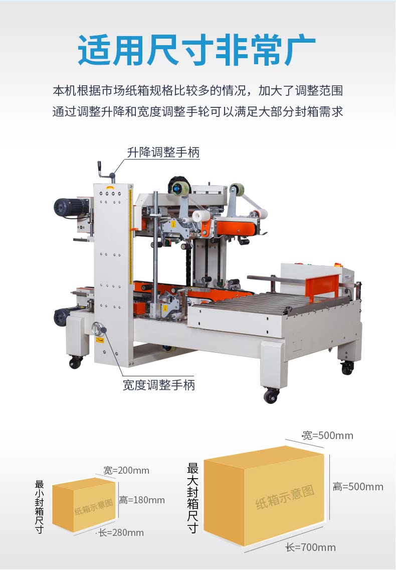 人工调节纸箱大小规格,自动同时四个角边封封箱;操作简单、使用方便、容易调整、封箱速度快、效率高、坚固耐用,适合配套自动化后道包装流水线全天候使用。胶带粘贴,抚平,整齐美观。用印字胶带,更可提高产品形象。 广泛应用在家用电器、纺织、食品、百货、医药、化工等行业。可与乐竞手机网页版登录入口配套使用,完成“工”字型封箱。