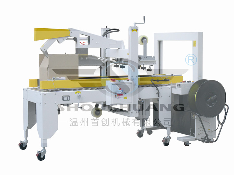 自动折盖封箱打包生产线集自动封箱及打包为一体的包装机,可配套自动化包装流水线使用,自动上下封胶带、多道打包,实现后道无人化包装,工作效率高。本条生产线的生产流程为:人工把纸箱底部折好,放到封箱机工作台板上面,然后往里面装产品,然后由人工推入至折盖封箱机或由输送台直接输送至折盖封箱机内,由两侧皮带夹持输送进去,进行自动折盖并上下同时封箱,封箱完成后,由封箱机两侧输送台,把纸箱输送至全自动打包机当中,当全自动打包机感应到纸箱过来后,便自动打包,第一道打包完成后,设备会自动把纸箱输出一定距离,然后进行第二道打包,然后再输送出去,打包便完成。