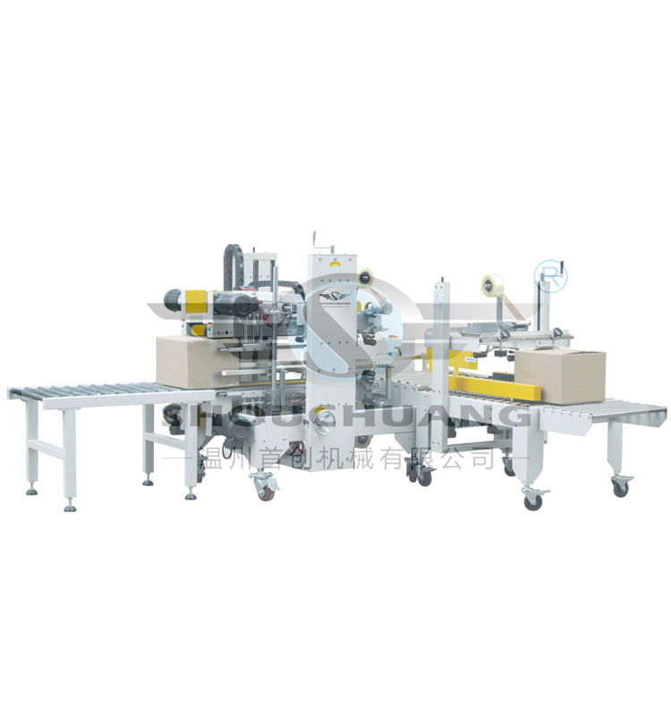 角边封箱机则负责完成四角边的纸箱胶带封箱,该封箱机性能稳定、品质可靠、封箱效率高、适用性强、使用寿命长;采用即贴胶带封口,经济快速、调整方便。两台机器配合起来即完成工字形封箱。