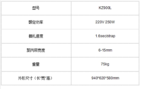 KZ900型半自动聚乙烯塑料带为捆扎材料、主要用于商业、邮政、铁路、银行、食品、医药、书刊、发行等行业的纸箱、木箱、纸包件、柳编箱、布包件的包装捆扎。在插入包装带后,机器能自动完成聚带、百叶窗、热合、切断并出带、且装有自动停机之功能。工作速度快、效率高、省时省力、打包质量高。
