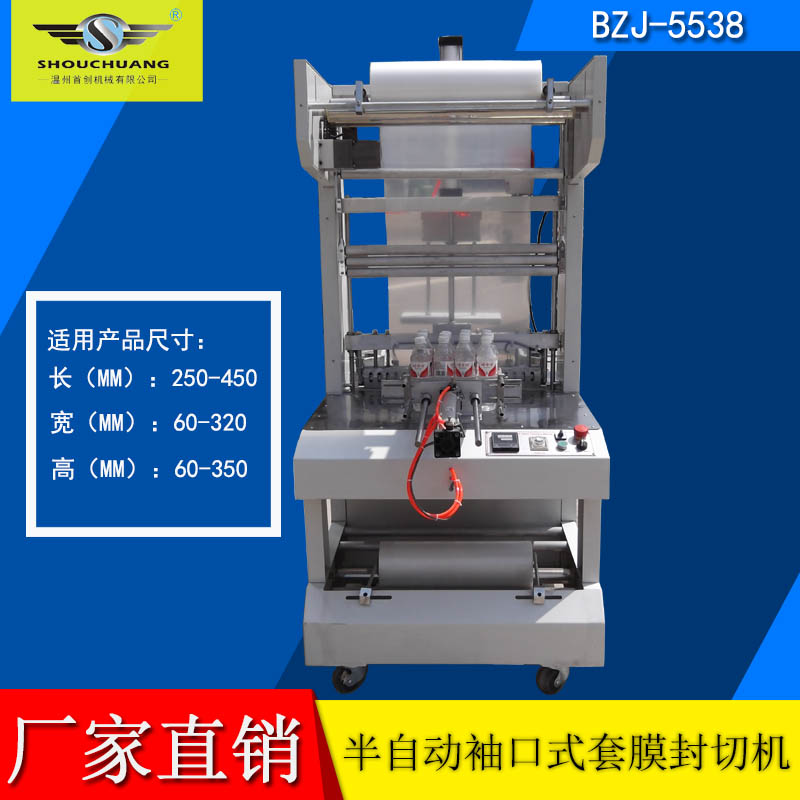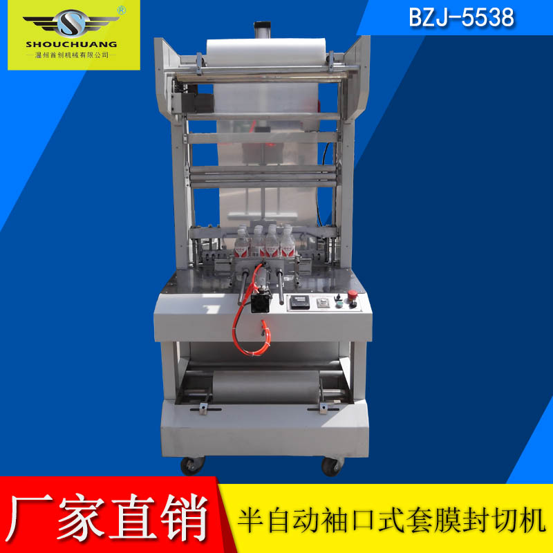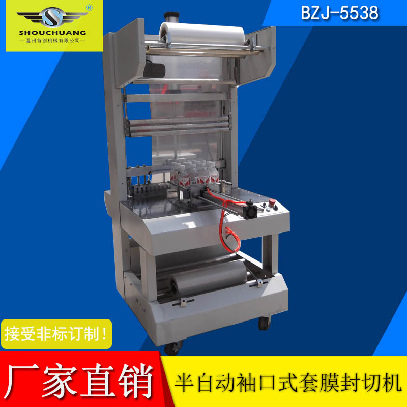 产品说明:BZJ-5538半自动套膜封切包装机采用气缸推料,机器自动封切进入收缩包装机。该袖口式套膜机适用于易拉罐,矿泉水,啤酒,玻璃瓶,饮料等各种瓶的无底托或有底托热收缩包装;同时与恒温PE收缩机配套使用,使物品达到理想的包装效果。本机整机性能稳定,使用寿命长。