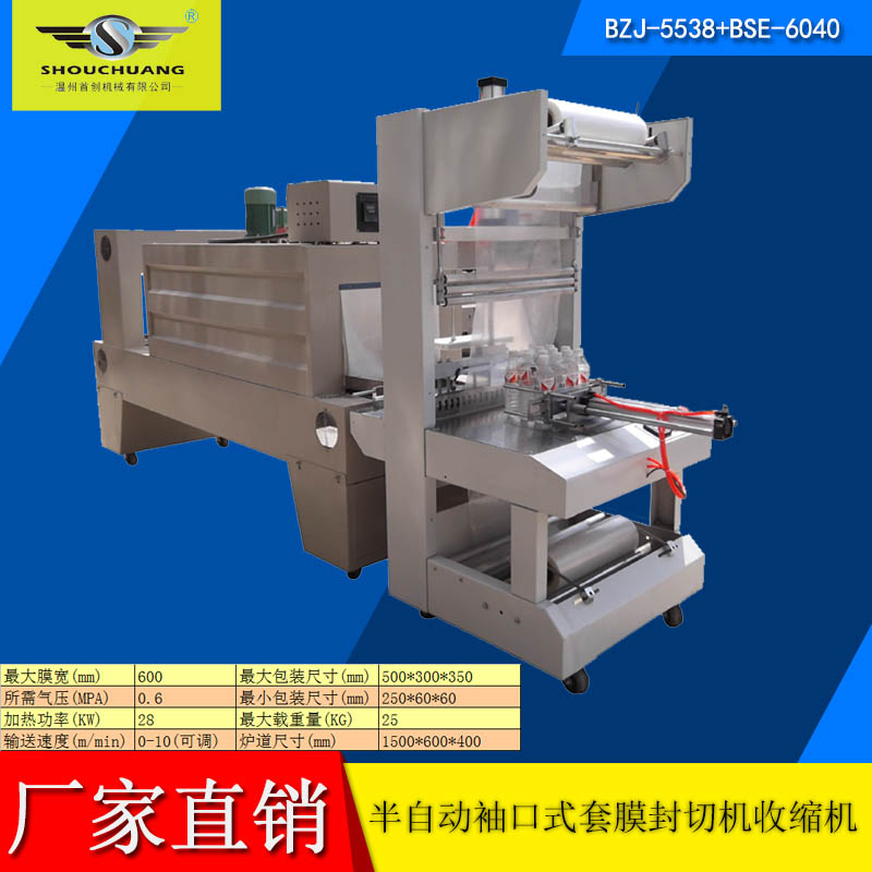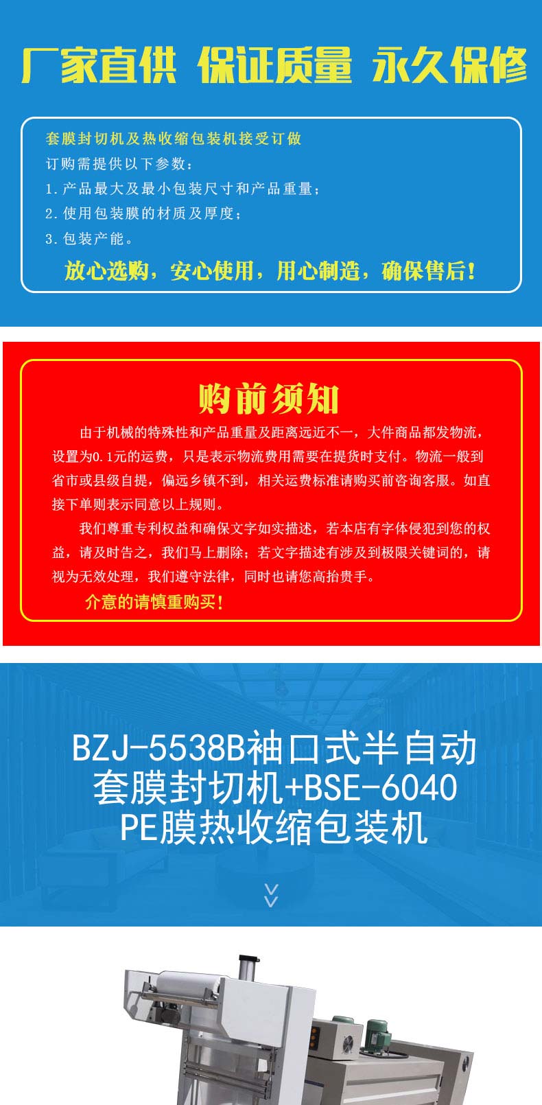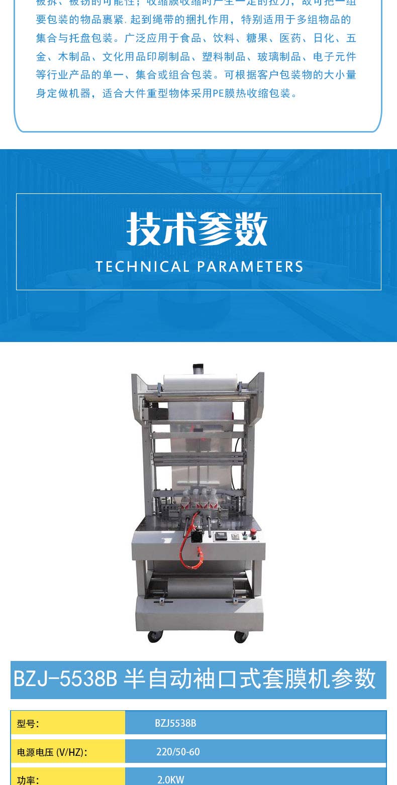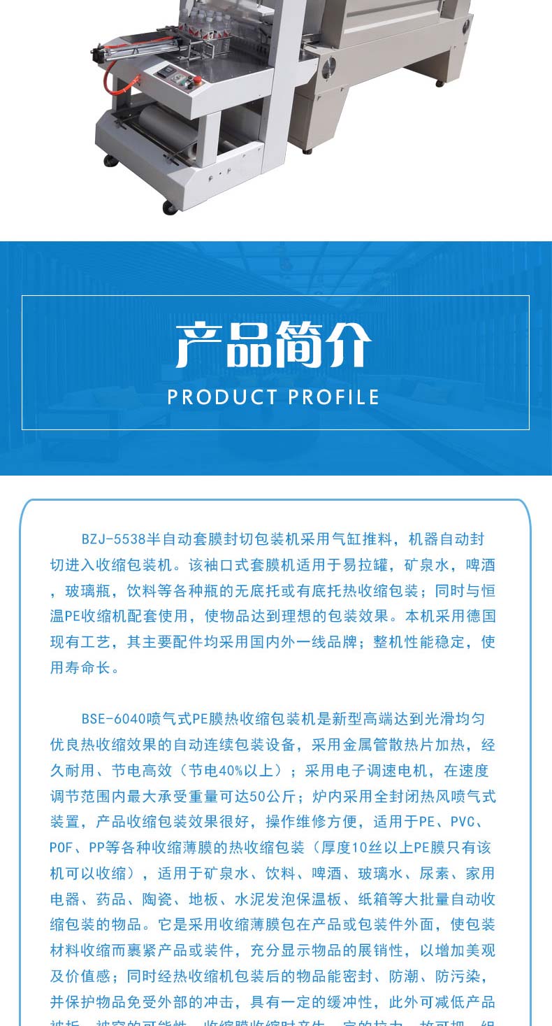 产品说明:BZJ-5538半自动套膜封切包装机采用气缸推料,机器自动封切进入收缩包装机。该袖口式套膜机适用于易拉罐,矿泉水,啤酒,玻璃瓶,饮料等各种瓶的无底托或有底托热收缩包装;同时与恒温PE收缩机配套使用,使物品达到理想的包装效果。本机整机性能稳定,使用寿命长。