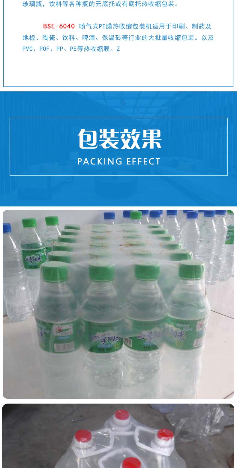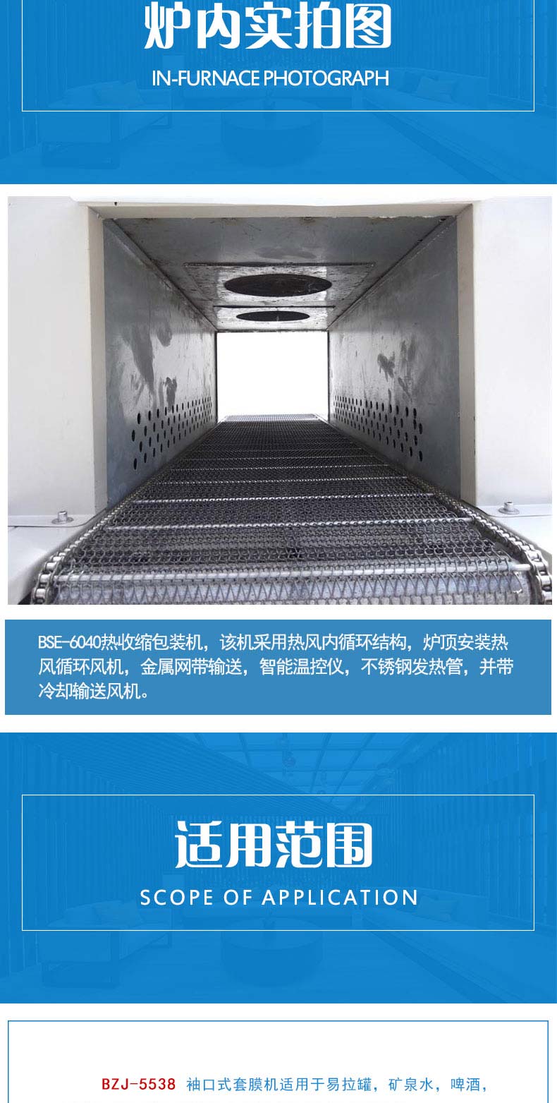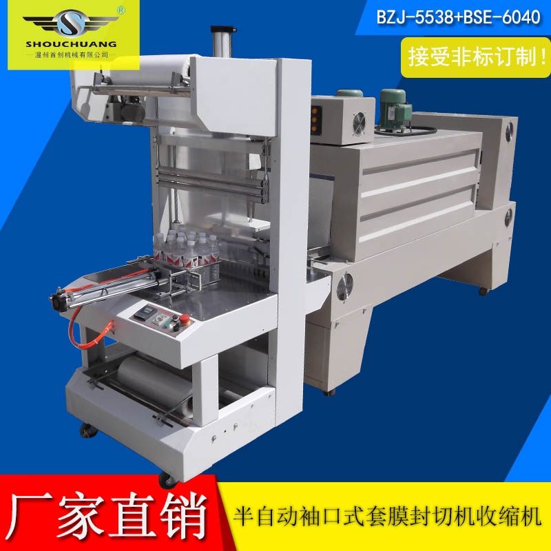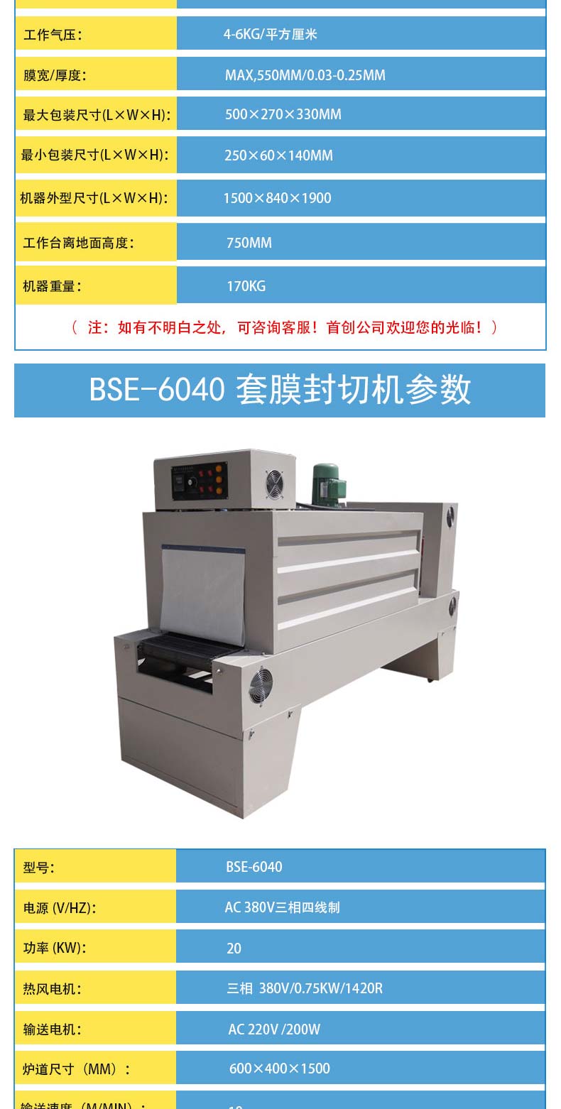 产品说明:BZJ-5538半自动套膜封切包装机采用气缸推料,机器自动封切进入收缩包装机。该袖口式套膜机适用于易拉罐,矿泉水,啤酒,玻璃瓶,饮料等各种瓶的无底托或有底托热收缩包装;同时与恒温PE收缩机配套使用,使物品达到理想的包装效果。本机整机性能稳定,使用寿命长。